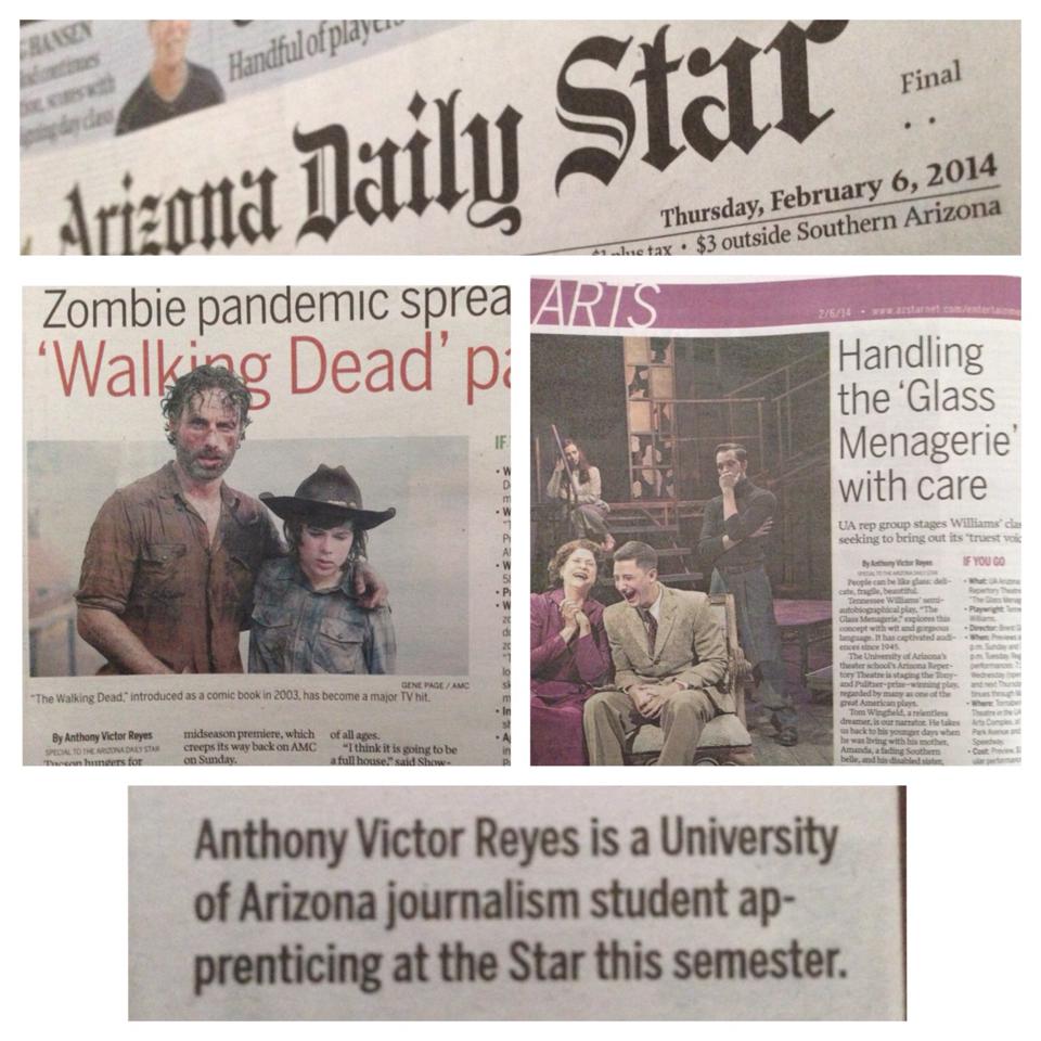 A story published in the Home and Life section of the Arizona Daily Star on March 23, 2014. It was a three-page spread article that led the section. This story was a first-person narrative about Anthony Victor Reyes’ experience with acting improvisation with Tucson comedy troupe, Not Burnt Out Just Unscrewed. The story is based on Anthony’s experience when he attended a improvisation class and a dress rehearsal, and performed on stage with members of NBOJU. The story was a part of Arizona Daily Star’s Kathy Allen’s three-part series covering Not Burnt Out Just Unscrewed. You can view the online version by clicking here.